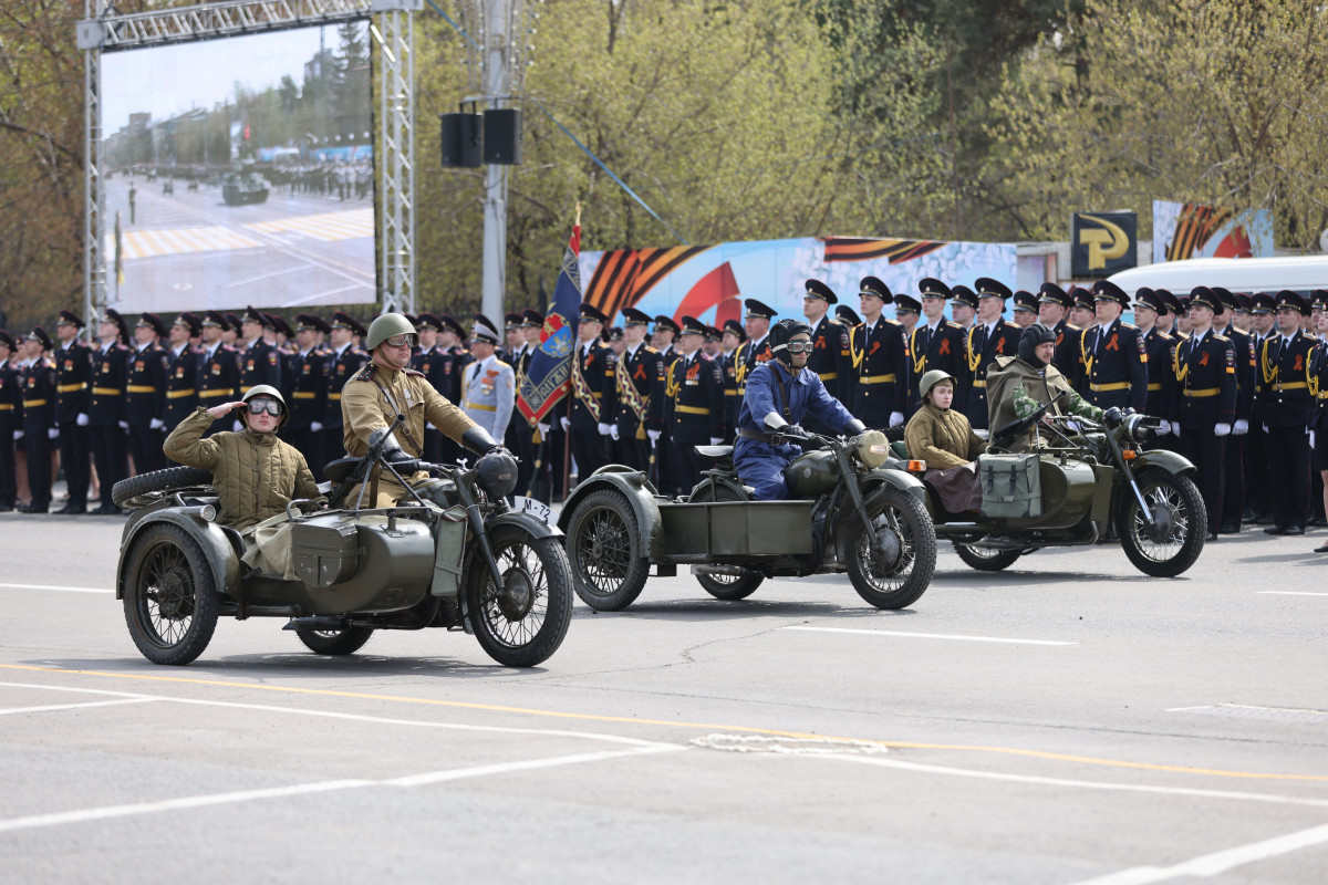 В Красноярске состоялось шествие в честь 77-й годовщины Победы в Великой Отечественной войне. С утра на площади Революции работала выставка военной техники, полевые кухни с солдатской кашей, звучала музыка военных лет. На экранах транслировались видеоролики о красноярцах – ветеранах Великой Отечественной войны.