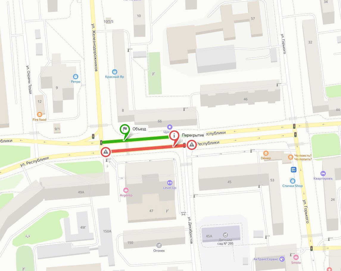 Напомним, что в центре Красноярска также ограничены проезды по улице Бограда на перекрестке с Перенсона, по улице Парижской Коммуны у перекрестка с Карла Маркса и на улице Горького на перекрестке с Ленина.