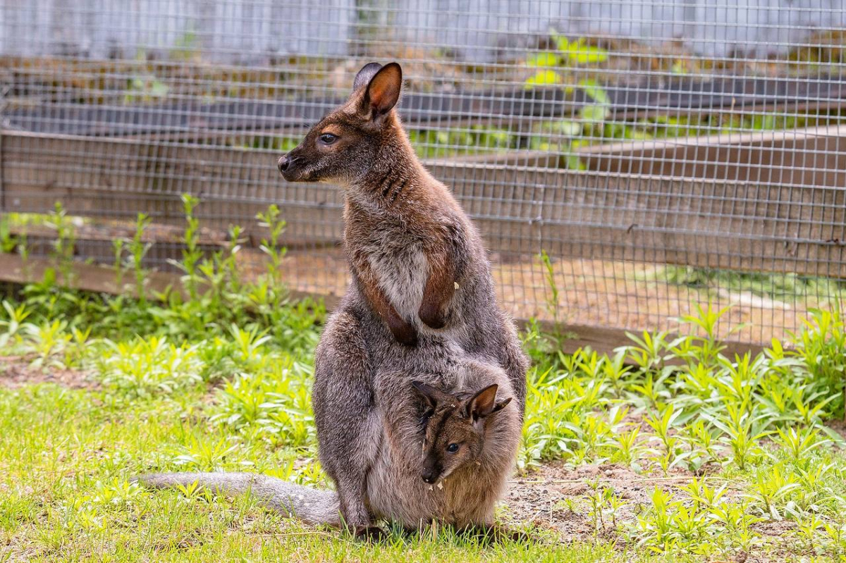 - С наступлением тёплой погоды и выпуска кенгуру в открытый вольер кенгурёнка можно видеть, но не полностью, а по частям, в сумке у матери. Иногда из маминой сумки высовывается голова, иногда задние лапы и хвост. Ну, а если повезёт, можно видеть кенгурёнка, высунувшегося по пояс, — рассказали в «Роевом ручье».