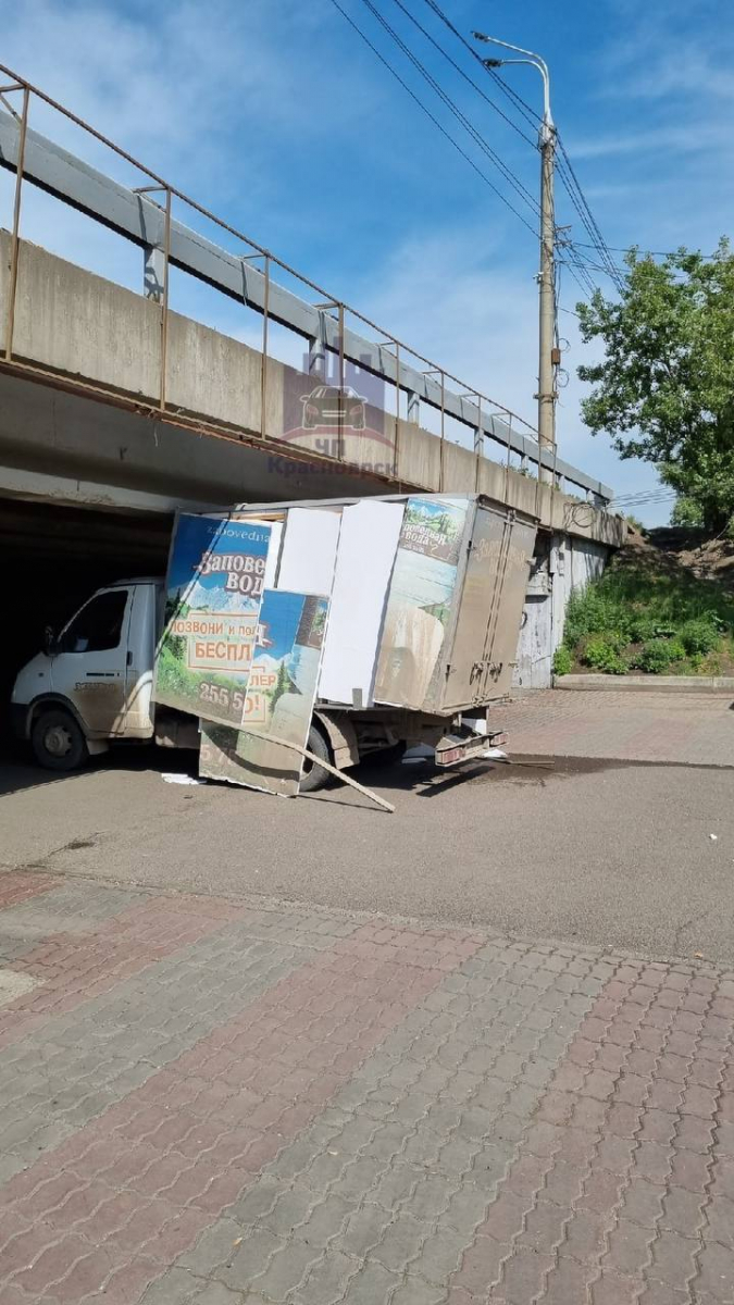 В Красноярске на острове Татышев газель, перевозящая питьевую воду, застряла под мостом. Фотографию инцидента опубликовали в телеграм-канале «ЧП Красноярск».