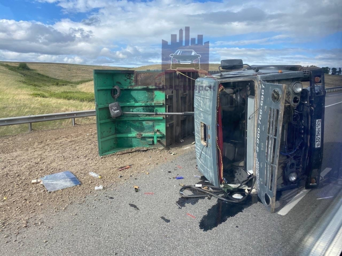 В ГИБДД «7 каналу Красноярск» рассказали, что водитель КАМАЗа не справился с управлением. Автомобиль наклонился вправо и опрокинулся набок.