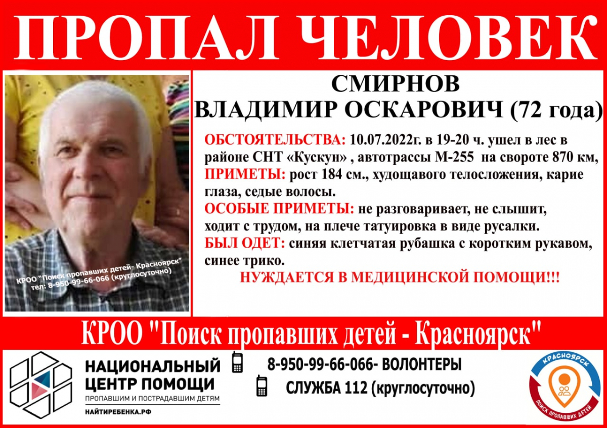 По информации волонтеров, он мог выйти к трассе M-255 и невнятно попросить довезти до Красноярска или в любой другой населенный пункт. Владимир Смирнов нуждается в медицинской помощи, он не слышит и ходит с трудом. Номер телефона волонтеров 8950-996-60-66.