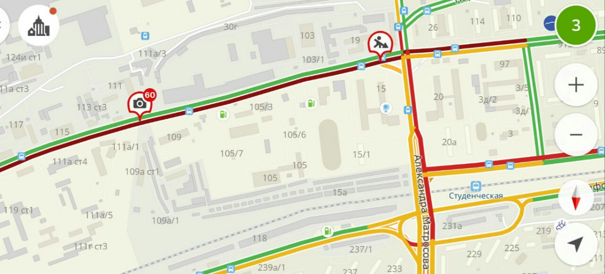 При «летнем» уровне пробок (сейчас в городе — всего три балла) самый серьезный затор начинается от дома 60 лет Октября 119 «Д» до дома 97, также страдают участки улиц Матросова и Свердловской — от станции «Белые Росы».