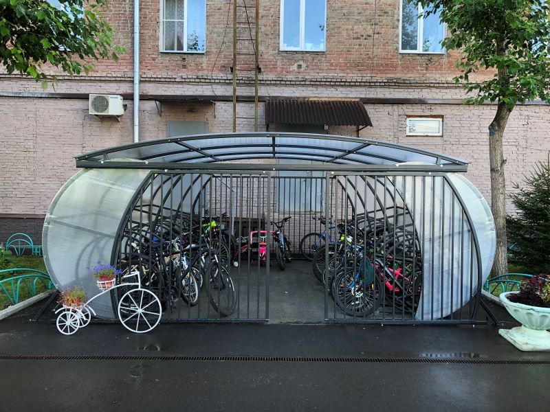 Теперь велосипеды и коляски защищены со всех сторон от ветра и дождя. Посторонним доступ к транспорту запрещен — конструкция закрыта на замок.
