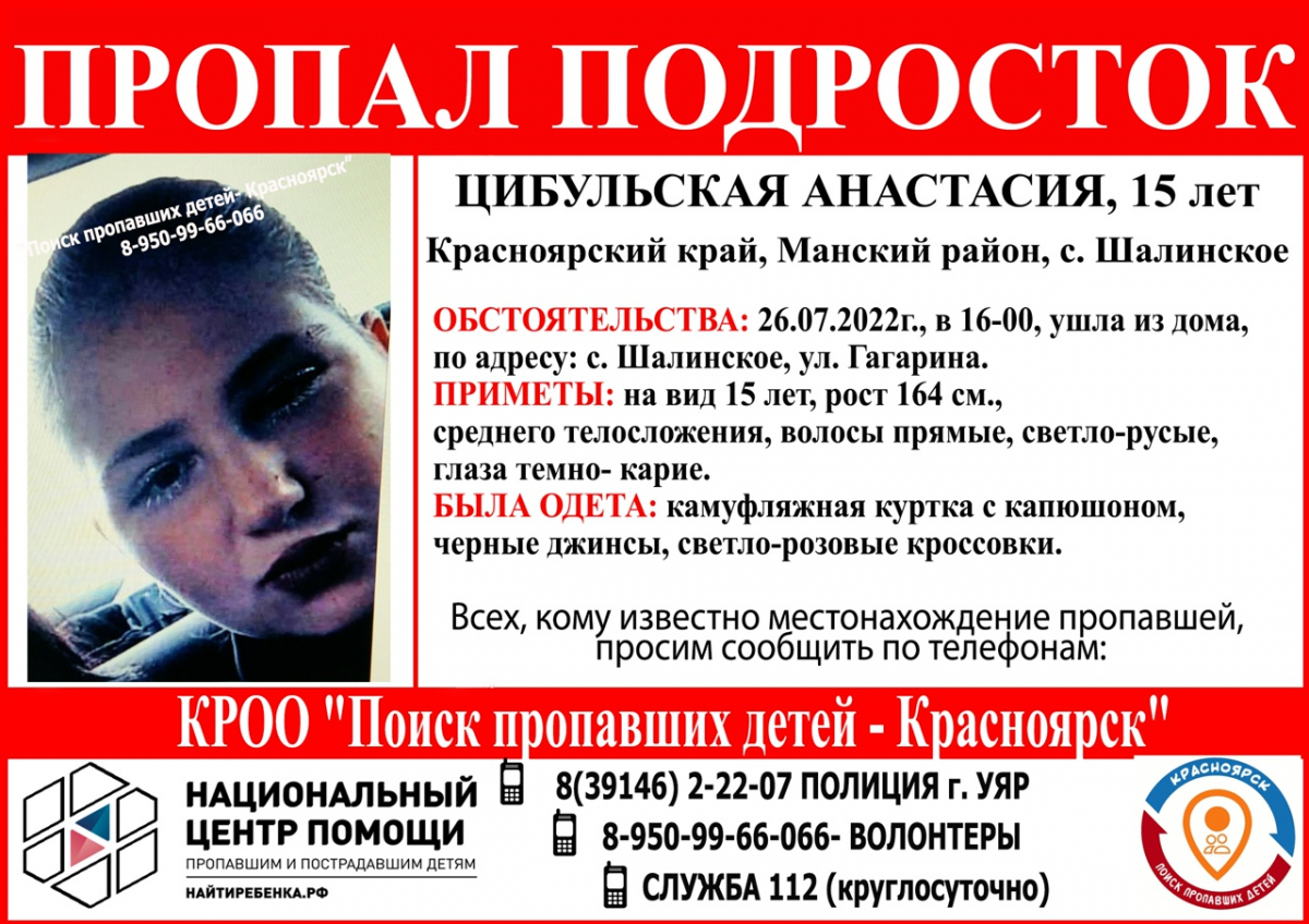 Всех, кому что-либо известно о местонахождении пропавшей, просят сообщить по телефонам: 8 (39146) 2-22-07 (полиция г. Уяр), 112 (единый телефон вызова экстренных оперативных служб) и 8-950-996-60-66 волонтеры (круглосуточно).