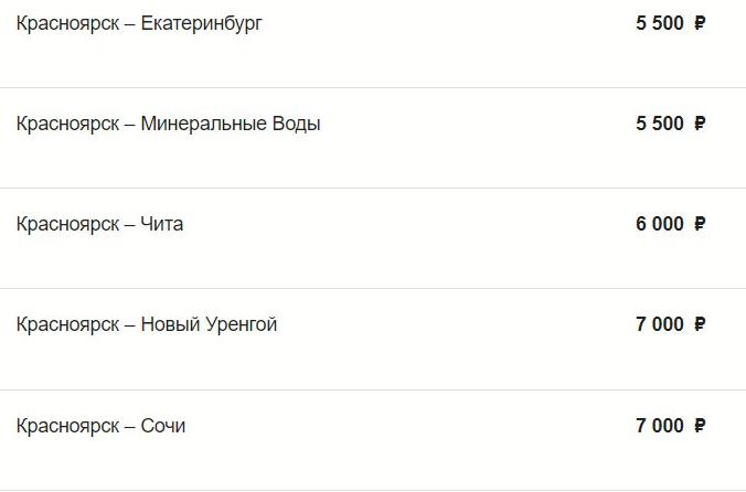 Так, улететь из Красноярска в Москву и Сочи можно в один конец за 7 тыс. рублей. В соседний Иркутск — за 2,5 тыс. рублей.