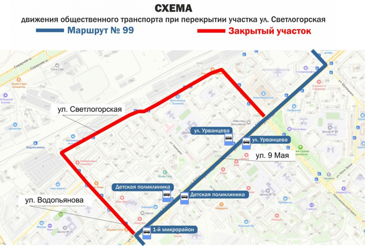 Автобус №99 поедет по новому маршруту из-за ремонта на Светлогорской. Об этом сообщили в мэрии. Теперь пассажиры будут ездить по ул. 9 мая, без поворота на Светлогорскую и Водопьянова. Остановки будут на Урванцева, Детской поликлинике и 1-м микрорайоне.