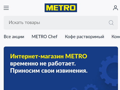 Заказ через приложение и онлайн-магазин временно недоступны, но вы можете беспрепятственно осуществлять заказы продуктов METRO через приложение и интернет-магазин СберМаркет».