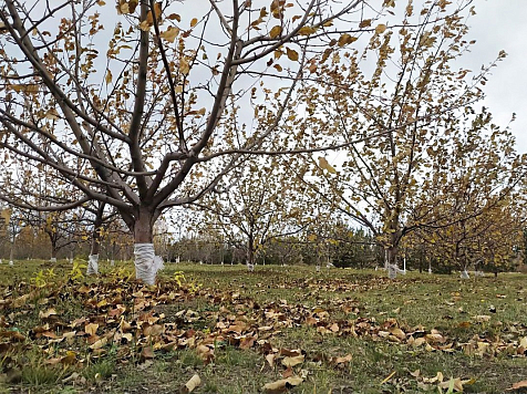Там стволы деревьев обмотали полипропиленовой лентой для того, чтобы зимой их не повредили мыши-полевки. Во время зимнего голода они начинают грызть кору плодового растения, из-за чего оно может даже погибнуть.