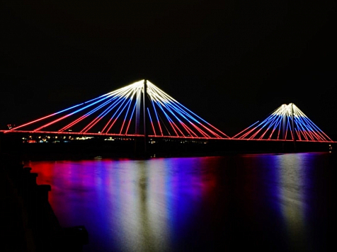 По словам мэрии, иллюминацию с цветами российского флага включают не только на Коммунальном и Виноградовском мосту, но и на БКЗ.