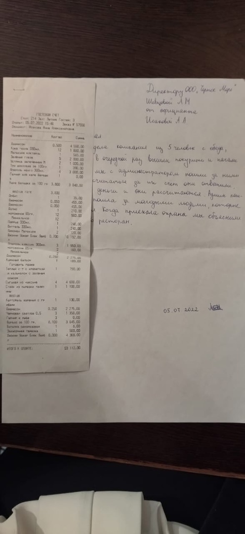 По его словам, пятого июля в 16:00 два парня и девушка заявились в ресторан и, уже по «традиционной схеме», отдыхали, ели, спокойно выпивали. Позже к ним присоединились ещё двое парней и девушка.