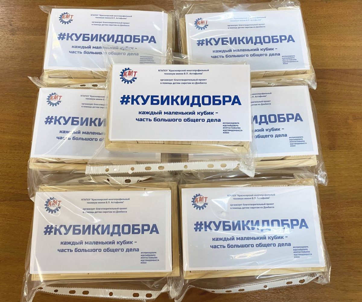 Студенты многопрофильного техникума им. Астафьева устроили благотворительный проект для детей Донбасса «Кубики добра» — шьют и мастерят игрушки для детей-сирот ДНР и ЛНР. Деятельность поддерживает Общественная палата Красноярского края.