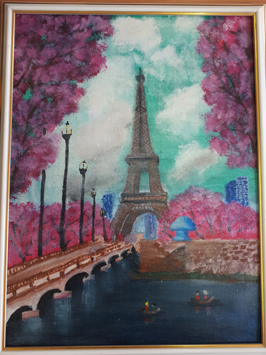 Среди картин — работа художницы из поселка Абан Кристины Кравченко Прогулка по Парижу».