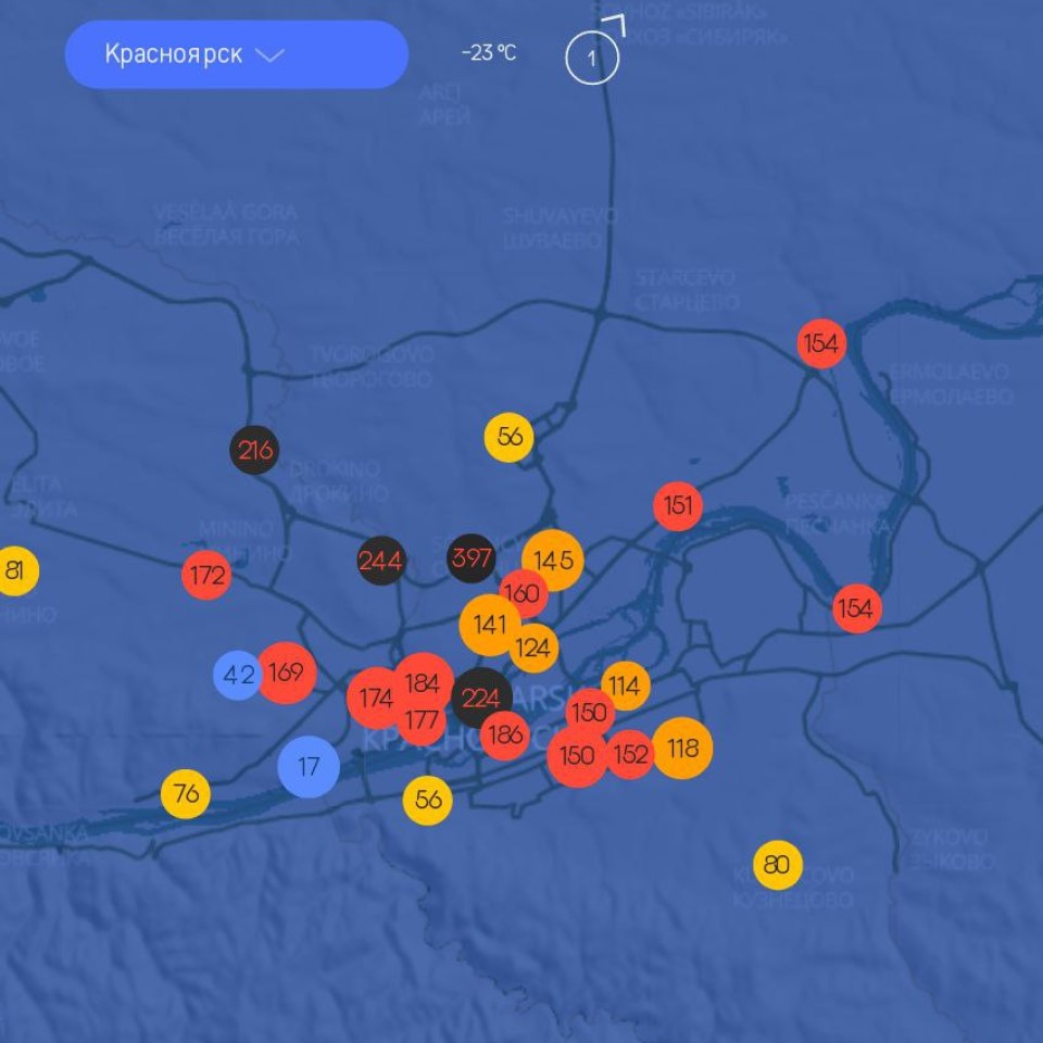 Ситуация ухудшилась в выходные. Об этом говорят датчики активистов «Красноярск. Небо». Сегодня индикаторы выявили превышение нормативов веществ в воздухе почти во всем городе. Так, например, на карте отображаются датчики преимущественно оранжевого и красного цвета – это высокие показатели загрязнения, а местами встречаются и черные.