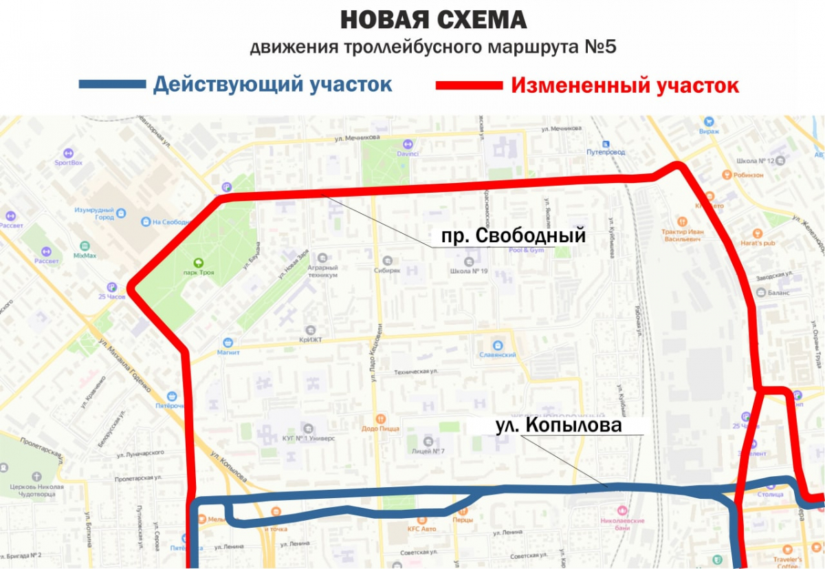 Раньше из-за ремонта улицы Маерчака троллейбусы ездили по улице Копылова. Теперь в сторону Студгородка жители Свободного смогут уехать напрямую. Движение автобусов № 83, № 63 и № 3 останется без изменений.