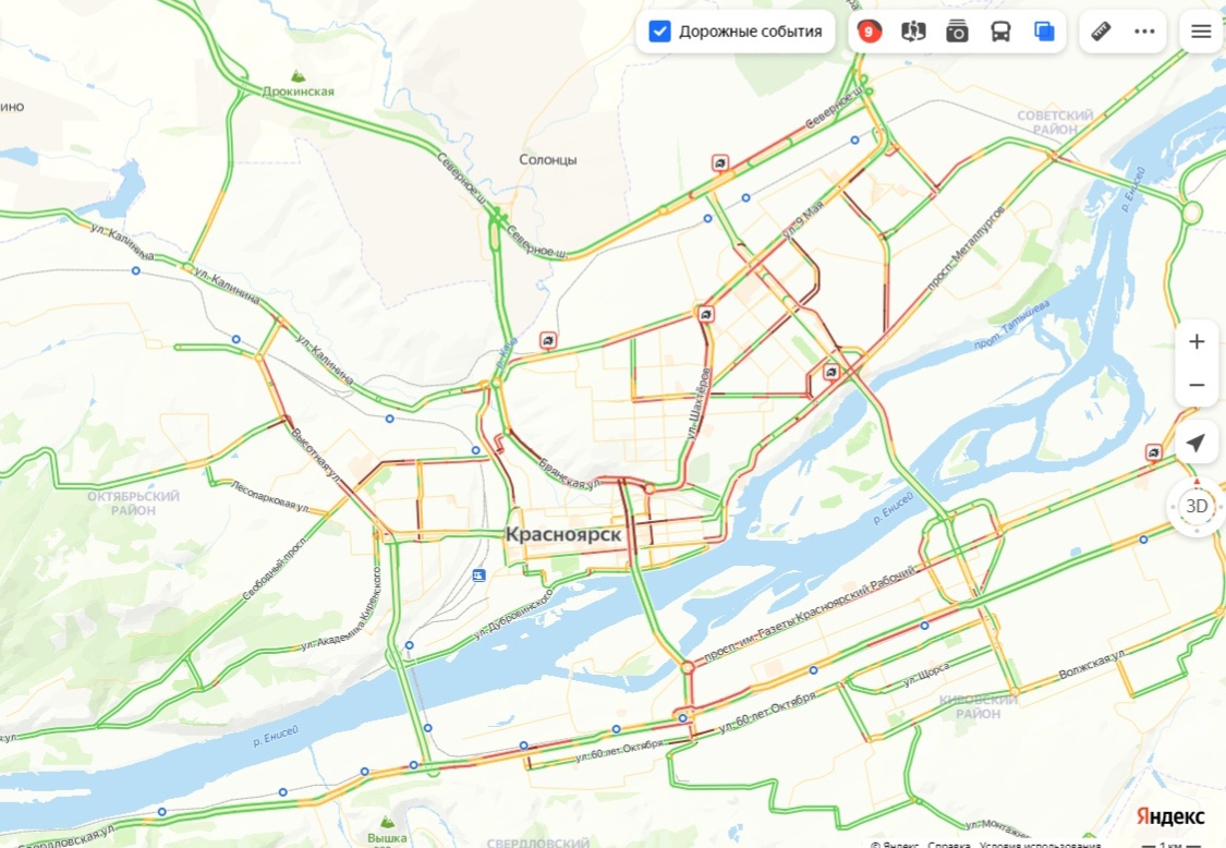 В Красноярске небывалые для будничного дня 9-балльные пробки
