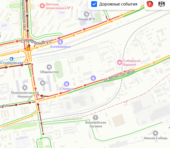 Согласно «Яндекс.Картам», заторы наблюдаются на улице Маерчака, Толстого, проспекте Свободном. Сложная ситуация на Копылова и Годенко. Частично встала улица Брянская.