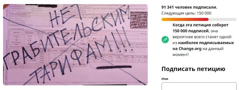 Цель таких обращений — найти нарушения или же выработать механизмы оплаты сумм, которые для большинства жителей региона оказались неподъемны.Сейчас горожане подписывают петицию против повышения тарифов. Инициативу поддержали больше 91 тысячи человек.