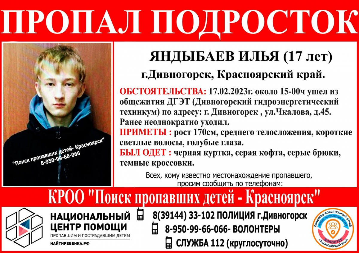 Если вам известно о том, где сейчас находится студент - звоните волонтёрам или в полицию. Номера телефонов: 8-950-996-60-66, 8-391-443-31-02.