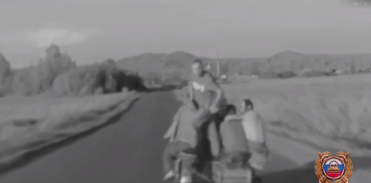 Шесть пьяных мужчин решили прокатиться на одном мотоцикле в Красноярском крае. 26-летний водитель вез друзей с кладбища, где они поминали товарища и выпили бутылку водки. В полиции по Красноярскому краю опубликовали видео.