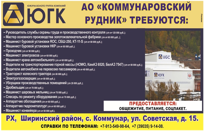 Самая большая золотодобывающая компания Хакасии «Коммунаровский рудник» показала высокооплачиваемые вакансии. Набор новых сотрудников проводится из-за расширения производственных мощностей и запуска новой фабрики. Мощность рудника увеличилась до 4,5 млн тонн золотоносной руды в год. В перспективе этот показатель планируется повысить в разы.