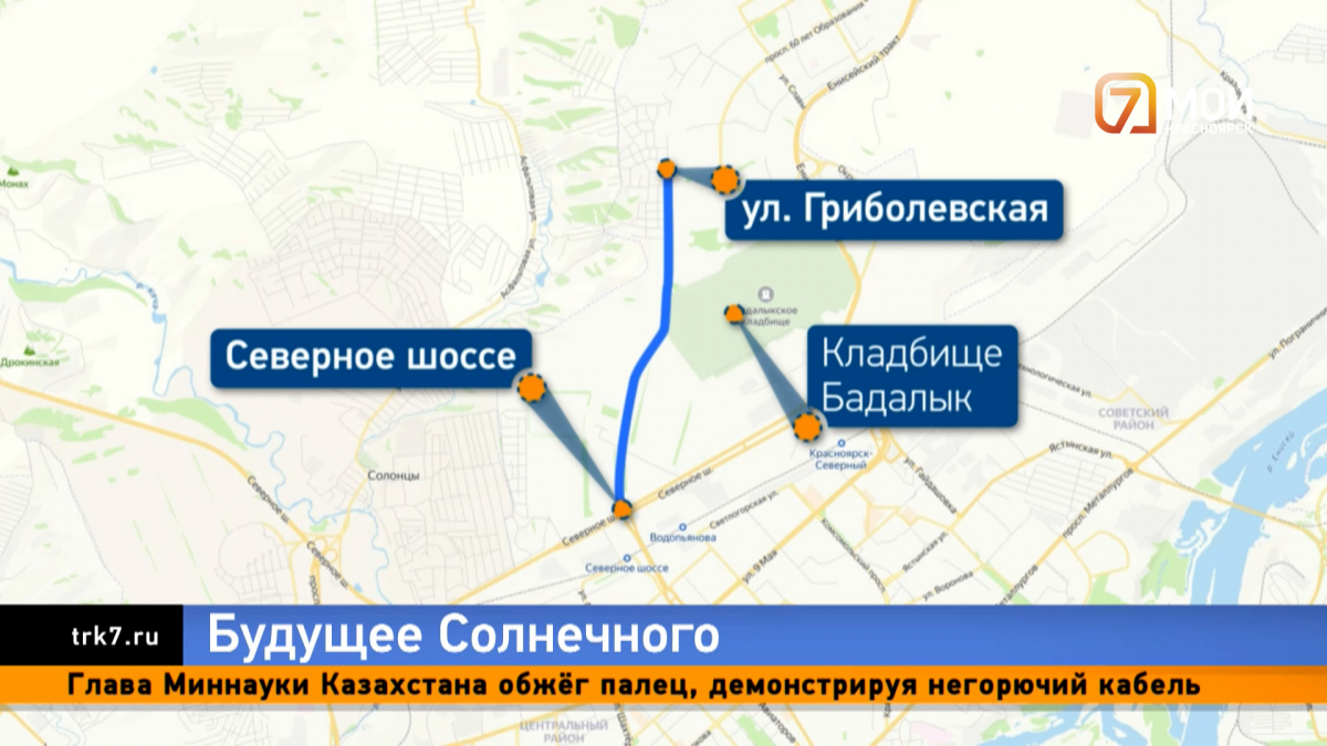 Это не просто дорога, а, можно сказать, мечта жителей Солнечного. Новый выезд к Северному шоссе разгрузит Енисейский тракт — по сути пока единственную дорогу в микрорайон. Новая магистраль пройдёт от улицы Гриболевская мимо Бадалыка, района «Солонцы-2» до Северного шоссе. Этот проект — часть подготовки Красноярска к 400-летию.