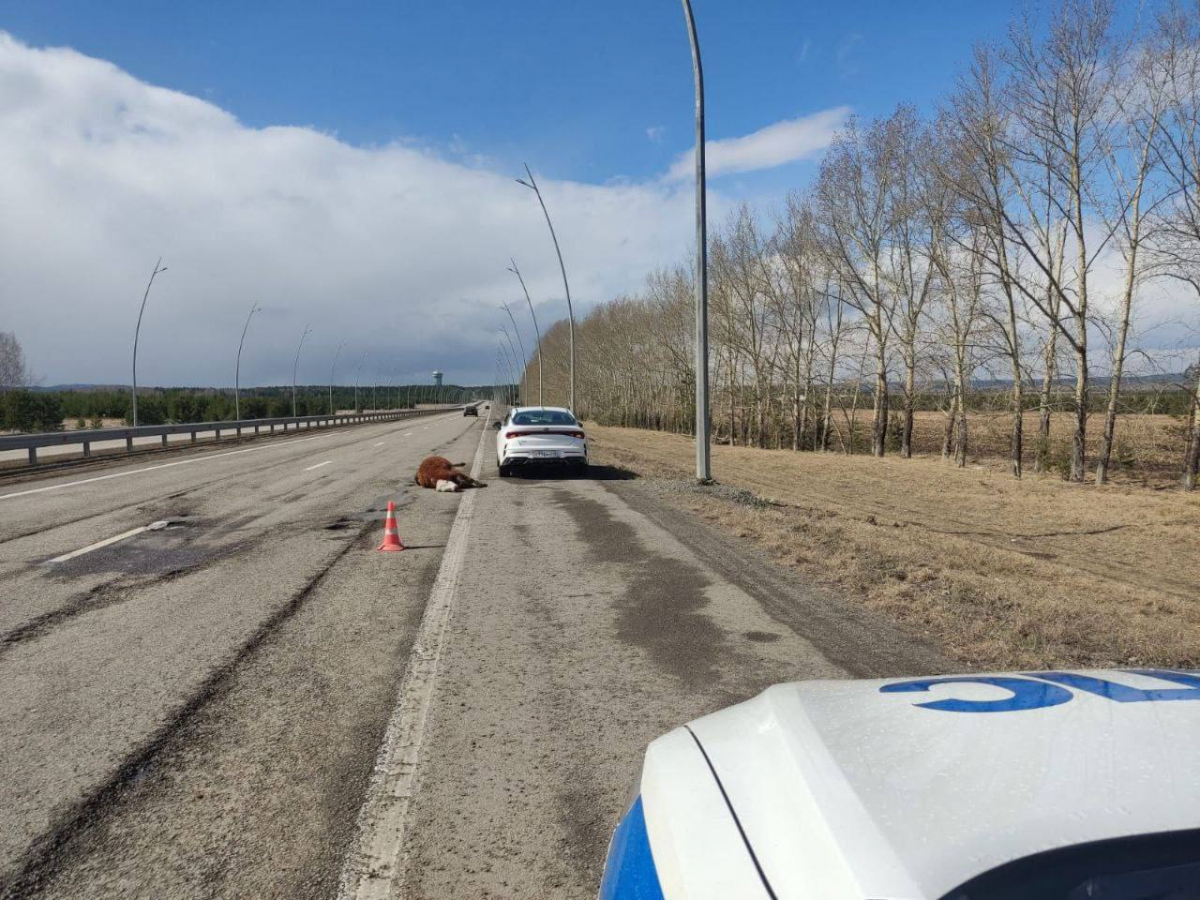 Под Красноярском 27-летний водитель белой «Киа Оптима» сбил внезапно вышедшую на трассу корову. Животное погибло на месте. Об этом рассказали в Госавтоинспекции по краю.