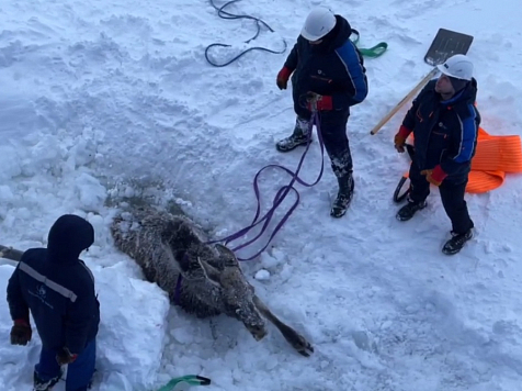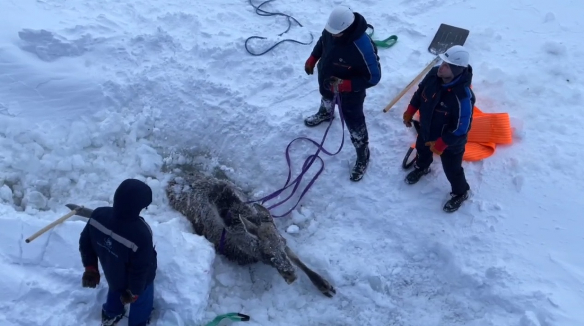 Сначала самку откопали ото льда и снега лопатами, но лосиха очень устала и не могла сама выбраться из ямы. Тогда мужчины обвязали ее тросом и подняли с помощью крана. Во время спасения они успокаивали самку и гладили по голове.