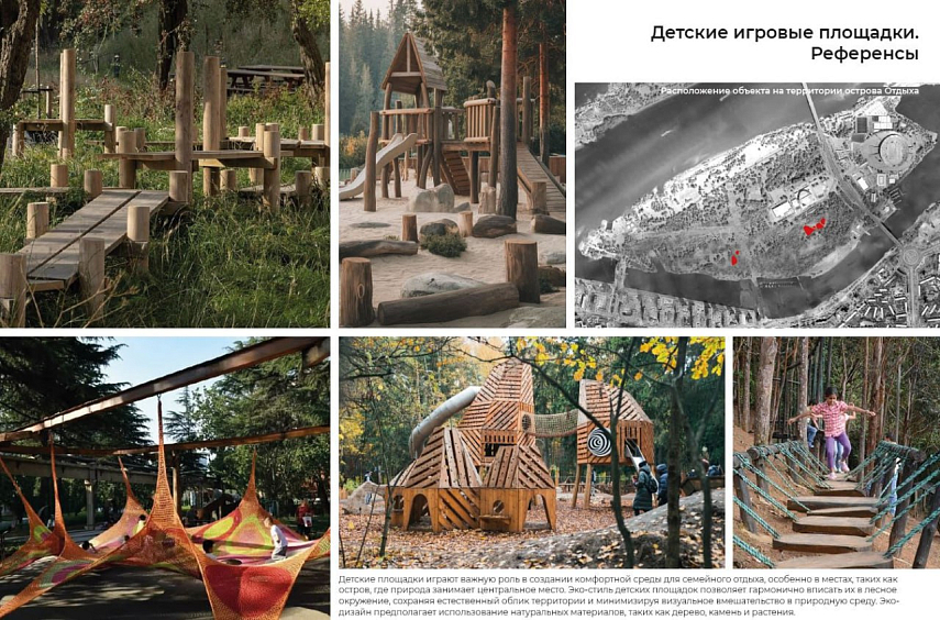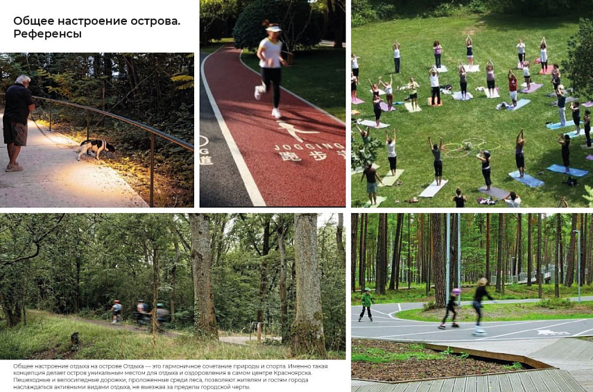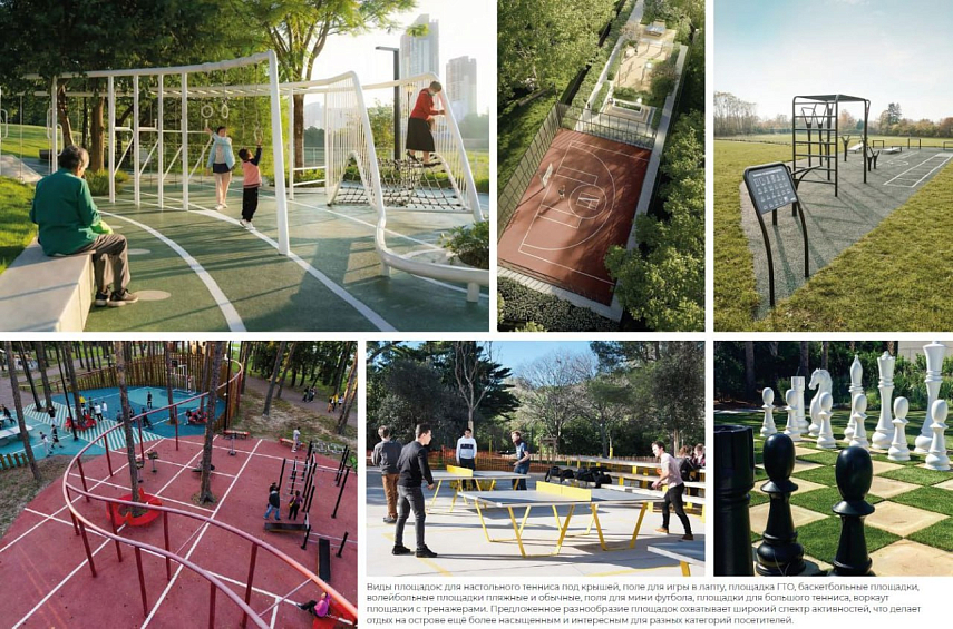 На представленной концепции проектировщики показали, что на территории могут появиться площадки для игр в футбол, волейбол, баскетбол, настольный и большой теннис, скейт-площадка, поле для игры в лапту и место для падела (разновидность тенниса). Детские пространства решили сделать из натуральных материалов вроде древесины и камня. Арт-объекты на острове смогут служить еще и ориентирами по локациям острова Отдыха.