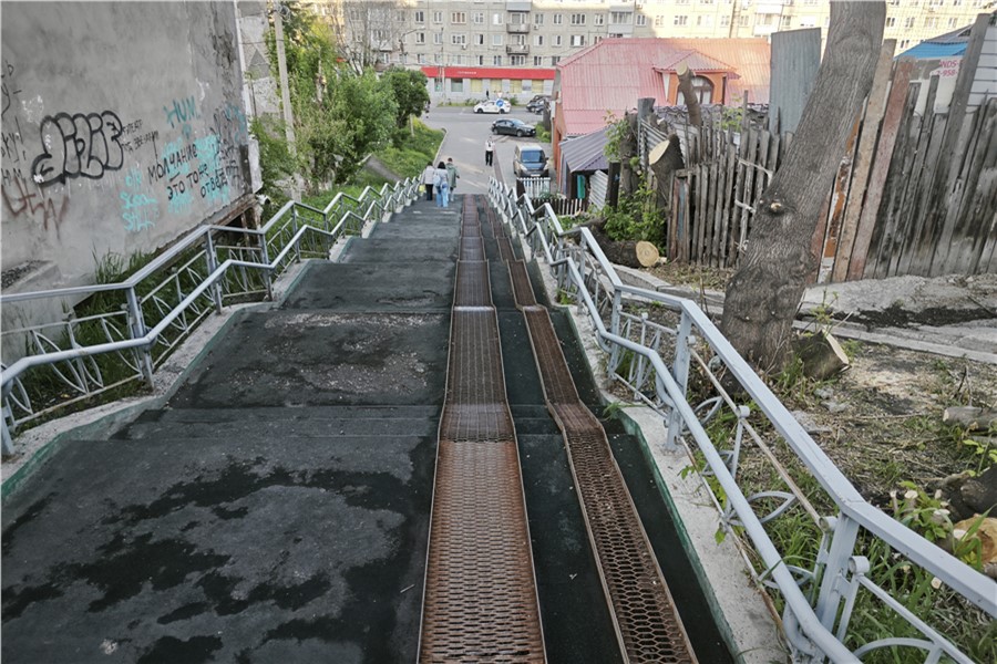 В Железнодорожном районе Красноярска разрушается лестница, построенная всего 4 года назад на улице Лидии Прушинской. Покрытие облезло, крошится бетон, а металлический пандус для колясок стал рыжим от ржавчины.