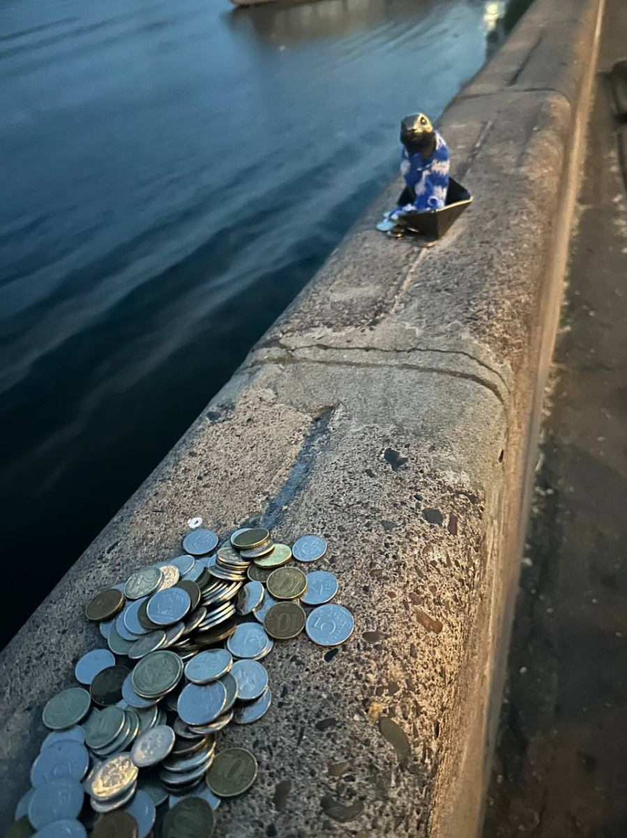 Горожане и туристы оставляют рядом с фигуркой монетки — как на удачу или исполнение желаний. В прохладную погоду кто-то даже надел на суслика шарфик.