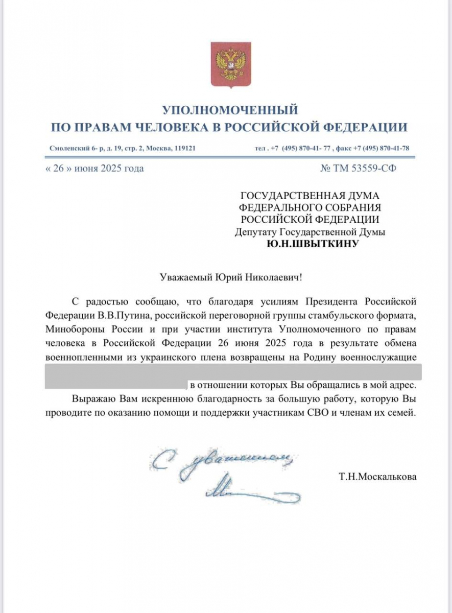 Три жителя Красноярского края возвращаются домой из украинского плена. Об этом сообщает депутат Госдумы от Красноярского края Юрий Швыткин. Он опубликовал письмо от уполномоченного по правам человека в РФ Татьяны Москальковой. В нем говорится, что благодаря усилиям стамбульской переговорной группы 26 июня освобождены из плена три жителя края, о которых депутат ранее хлопотал.