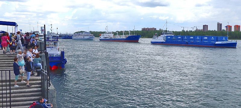 В акватории выстроятся 7 судов, среди которых — теплоход «Солнечногорск» класса река-море, прибывший из порта Подтесово. Он работает по маршрутам до Диксона и почти не заходит в Красноярск.