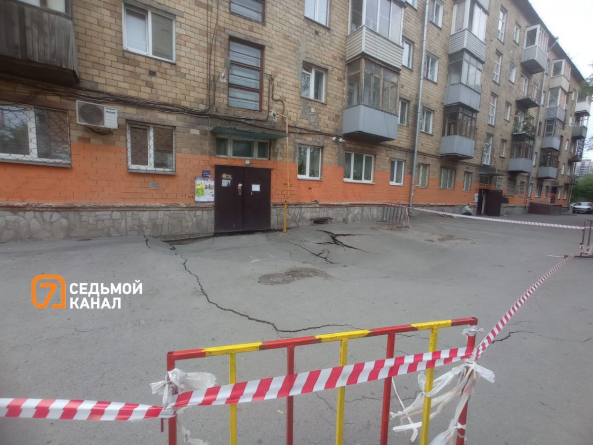 Грунт «поплыл» сегодня в 5:38 утра. Несущая стена дома и фундамент просели на метр в глубину. Момент попал на камеры видеонаблюдения. Тут же коммунальные службы перекрыли воду и огородили участок с провалом. Рядом выставлены наблюдающие.