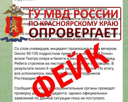 В Красноярске полиция опровергла распространяемую в Telegram-каналах информацию о массовом конфликте подростков возле театра оперы и балета. Сообщения о драке появились накануне, после чего на место выехал наряд полиции.