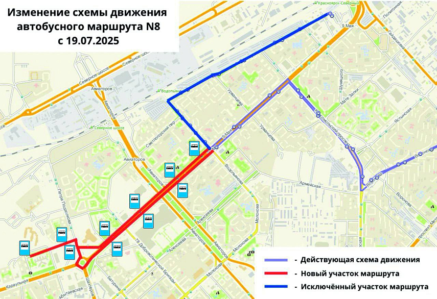 Как рассказали в ведомстве, на изменение маршрутов автобусов №8 и №88 повлияли обращения жителей микрорайонов Северный и Преображенский. Поэтому теперь автобус №8 перестанет заезжать на улицы Водопьянова и Светлогорскую. После остановки «Детская поликлиника» он поедет по улицам 9 Мая и Петра Подзолкова. Конечная остановка теперь «Кардиоцентр», вместо «ст. Красноярск-Северный».