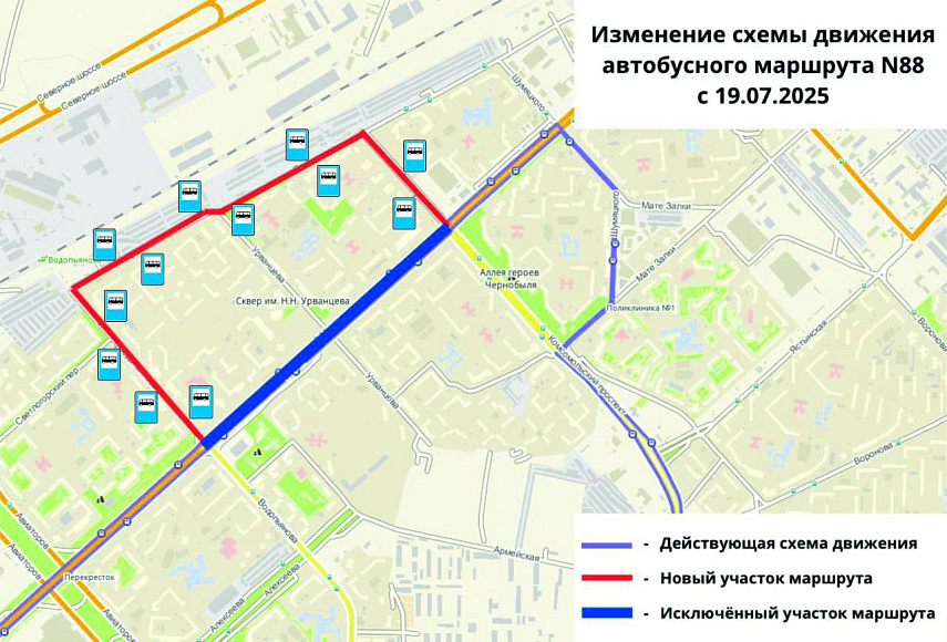 А автобус №88 теперь будет заезжать на улицы Светлогорскую и Водопьянова. Из маршрута убрали остановки: «1-й микрорайон» (по ул. 9 Мая), «Детская поликлиника», «Урванцева», но добавили остановку «Общежитие» (проспект Комсомольский). Ездить по новому маршруту транспорт начнет через девять дней, 19 июля.