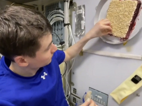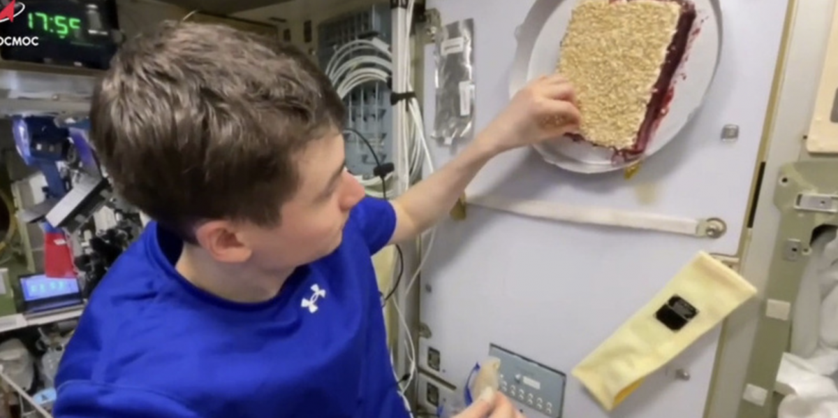 На видео он показал, как создает торт из медовых коврижек, творога с орехами и дробленой брусники с сахаром. Во время готовки торт пытался «улететь» в невесомости, но космонавты удерживали его на вертикальной панели. Орехи тоже разбегались, но их аккуратно добавляли в крем. В итоге получился небольшой космический торт.