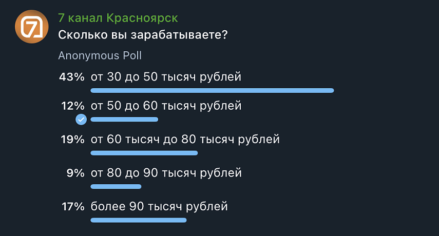 «7 канал Красноярск» провели опрос Красноярцев в своем телеграмм-канале — у жителей спросили, сколько они зарабатывают в месяц, вот такие результаты получились:
