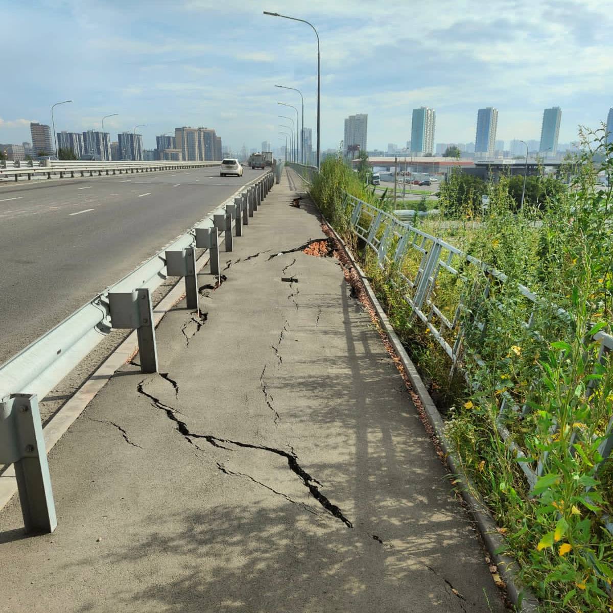 Специалисты обнаружили повреждения покрытия и значительные провалы грунта под тротуаром и проезжей частью возле опоры №6. В мэрии уточнили, что первые трещины были замечены еще в июле, однако подрядчик не предпринял никаких мер для их устранения:
