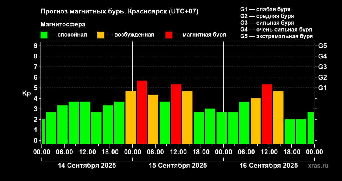 По словам специалистов, магнитные возмущения начнутся уже в ночь на 15 сентября. Буря будет держаться на отметке G2, ее характеризуют как средняя. Геомагнитные излучения начнут утихать вечером, но их колебания будут наблюдаться до обеда 16 сентября. Полностью магнитосфера успокоится к 18:00 вторника.