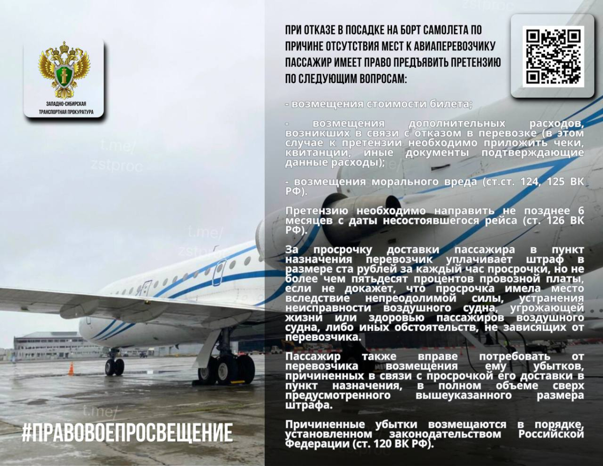 Западно-Сибирская транспортная прокуратура выявила случай нарушения прав пассажира. В июле 2025-го авиаперевозчик отказался взять на рейс человека, планировавшего по ранее купленным билетам улететь из Подкаменной Тунгуски в Красноярск. В самолете не оказалось свободного места.