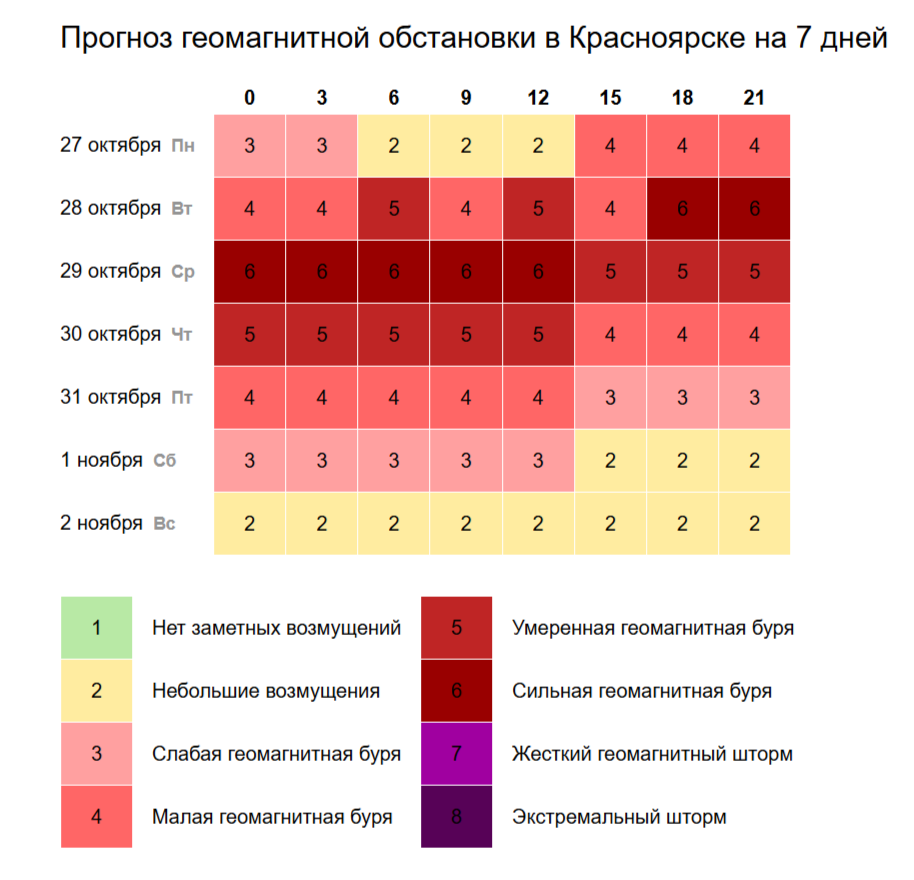Геомагнитные возмущения силой в пять баллов накроют красноярцев завтра днем, 28 октября. Однако к вечеру буря усилится до шести баллов. Такие геомагнитные возмущения будут в Красноярске и на следующий день, до 12 часов дня 29 октября. Позже магнитная буря ослабеет до пяти баллов, а еще через день — до четырех.