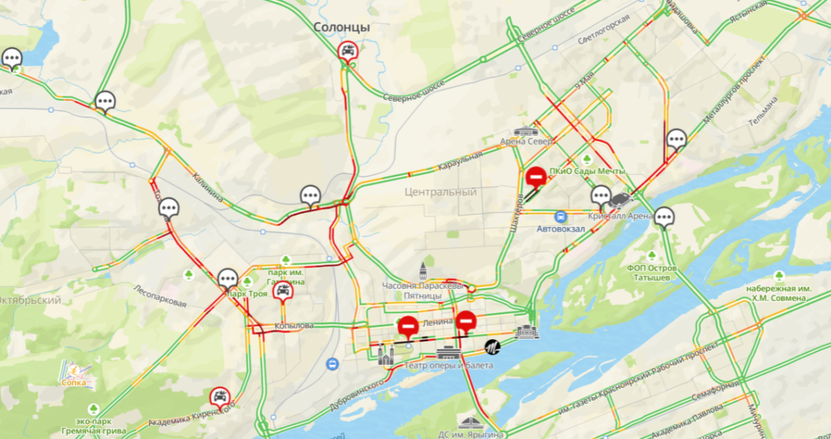 Отметим, сейчас пробки оценивают в пять баллов. Ситуация на правом берегу улучшилась, на левом продолжается затруднение движения.