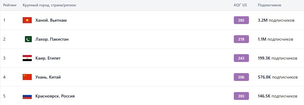По данным на 12:30 пятницы 6 февраля рейтинг выглядит так. Все «фиолетовые» позиции — это города с очень вредным воздухом по версии платформы: