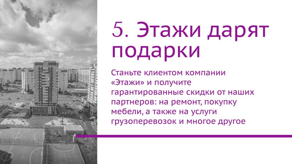 Станьте клиентом компании «Этажи» и получите гарантированные скидки от наших партнеров на ремонт, покупку мебели, услугу грузоперевозок и многое другое.