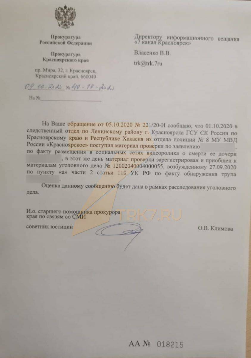 В краевой прокуратуре «7 каналу Красноярск» рассказали, что 1 октября мама девочки подала заявление в полицию по факту размещения в социальных сетях видеоролика о смерти ее дочери. Его приобщили к уголовному делу. Оценка данному инциденту будет дана в рамках расследования уголовного дела, подытожили в ведомстве.