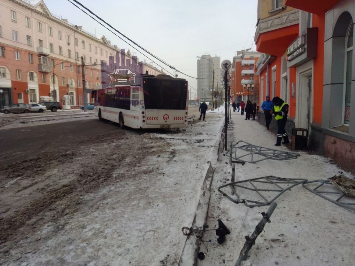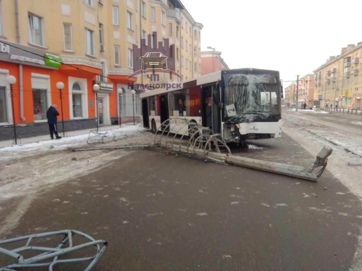 На кадрах видно, как автобус №2 стоит с разбитым стеклом и бампером на дороге. Рядом с маршруткой лежит поваленный столб и ограждение.