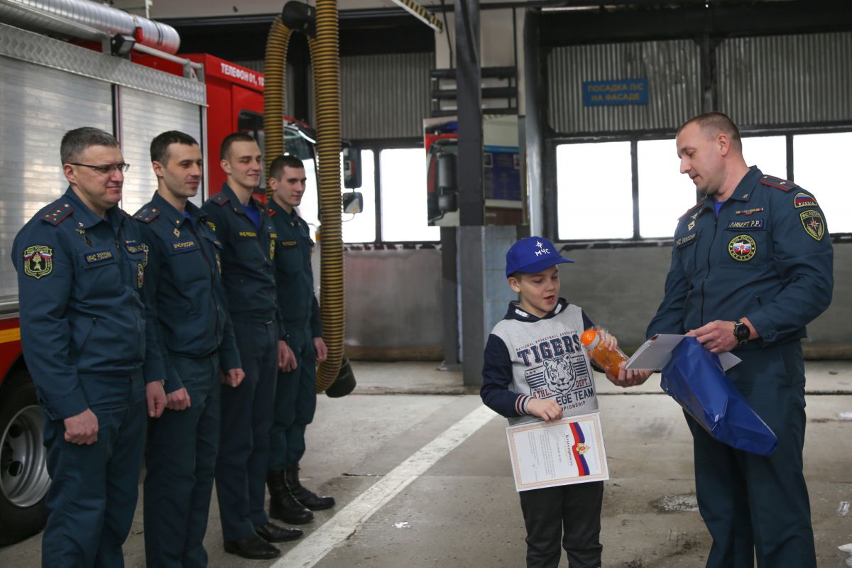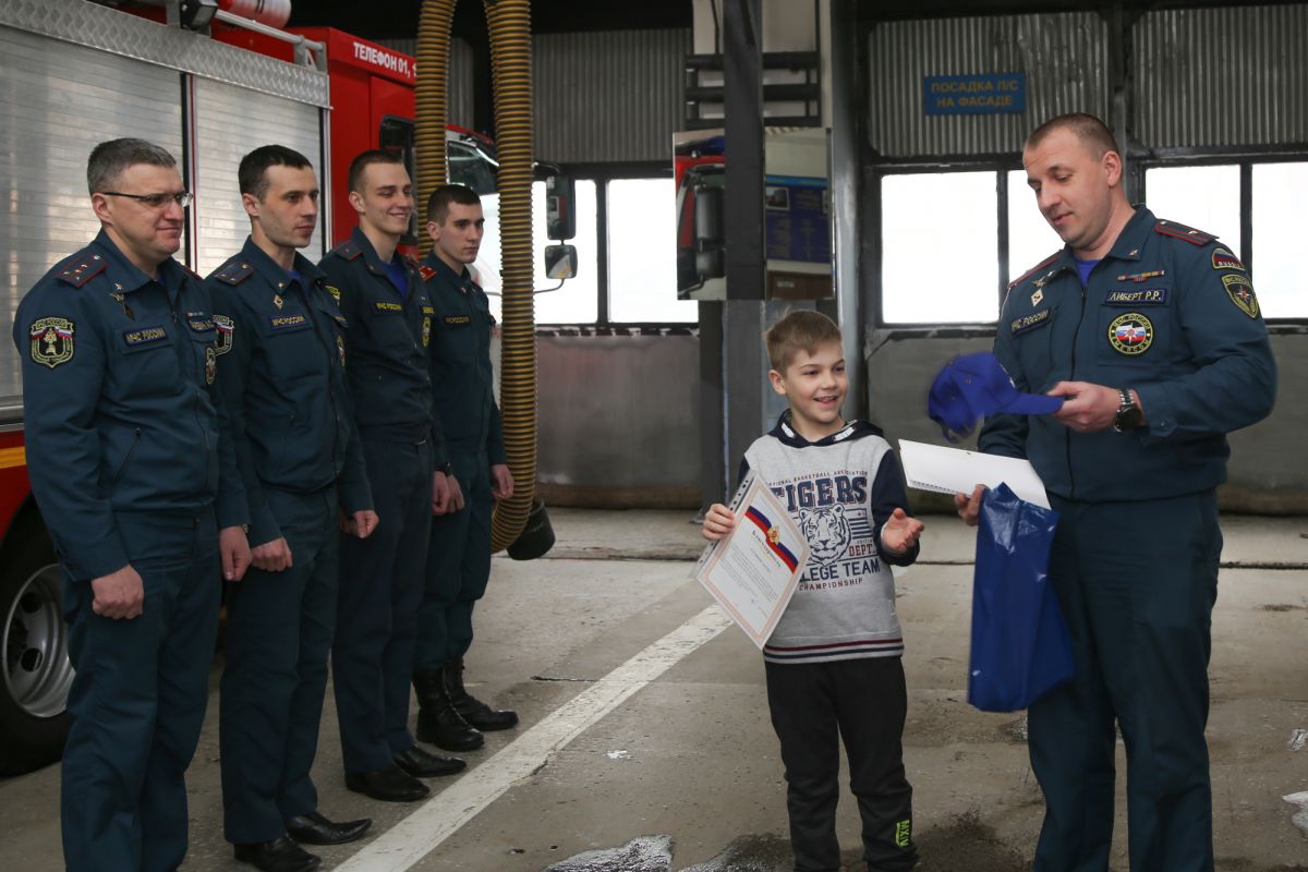 Спасатели поздравили школьника и вручили ему благодарность и памятный подарок. Судя по фотографиям — это кепка МЧС и бутылка. Мальчик на память сделал фото с пожарными.