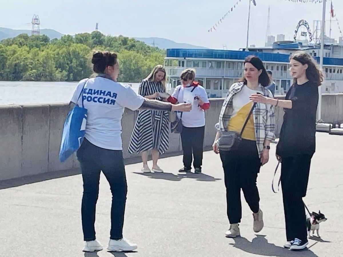 Партийные волонтеры дарили землякам открытки с изображениями известных людей в истории России и Красноярского края, а также вручали ленточки-триколор. Все желающие могли подписать открытку адресату в любой точке страны, и отдать партийным волонтерам, которые отправят все поздравления по указанным адресам.